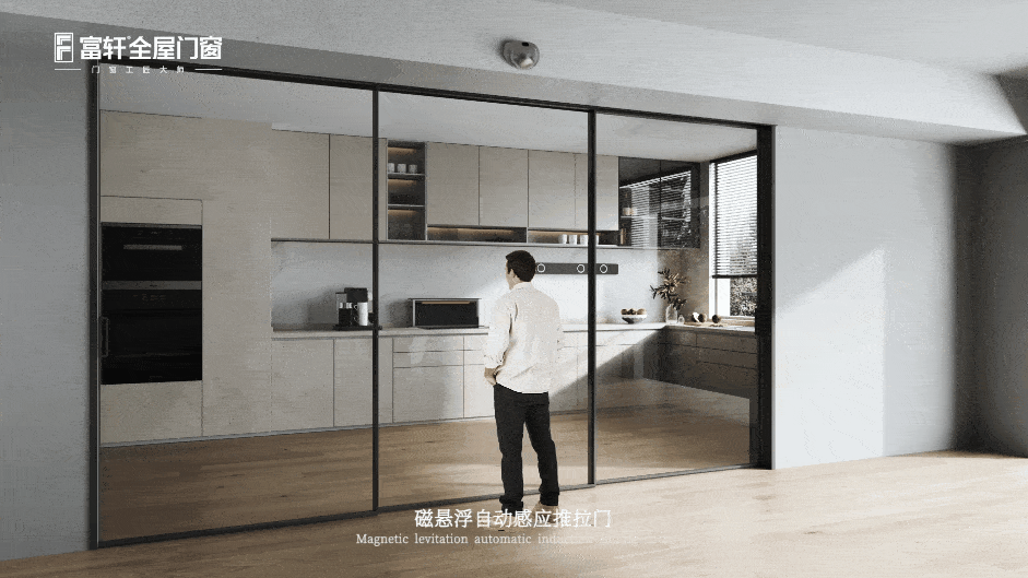 針對廚房油煙大,容易產生灰塵的問題,可以選擇富軒全屋門窗磁懸浮自動感應推拉門,玻璃+智能開關,讓空間變得通透有趣。